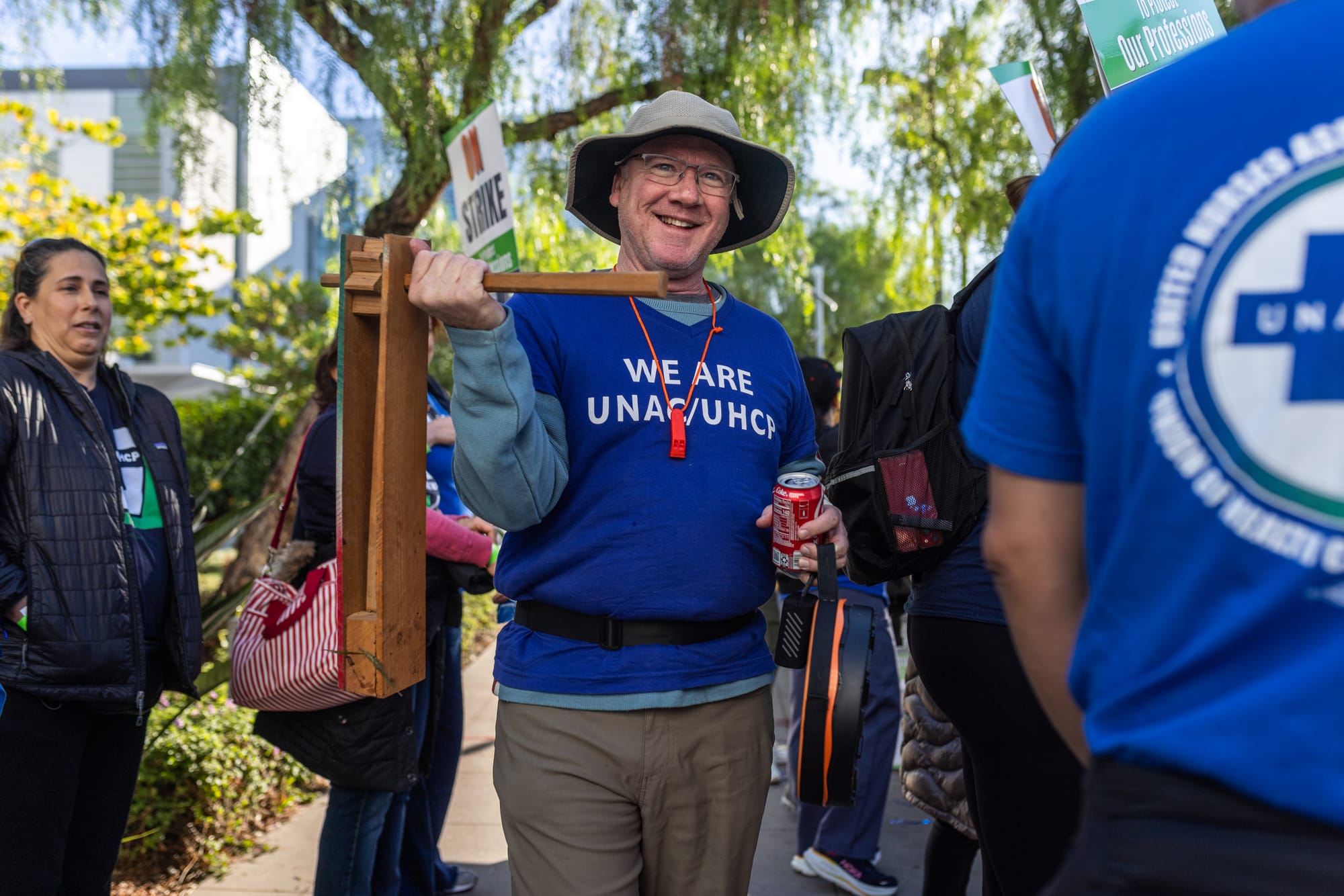 Emergency Room RN (Registered Nurse) Hector Raygoza stood outside the Los Angeles Medical Center last Wednesday, where he has worked for decades. Decked out in a neon yellow vest and union t-shirt, he shared his thoughts about why it was important for workers to come out on strike in the midst of bargaining. "We're out here--it's a joyous crowd--this how we treat our patients: with joy," he said. "We love our patients, and we wish we were in there taking care of them, but we have to do this in order to have our voices heard."