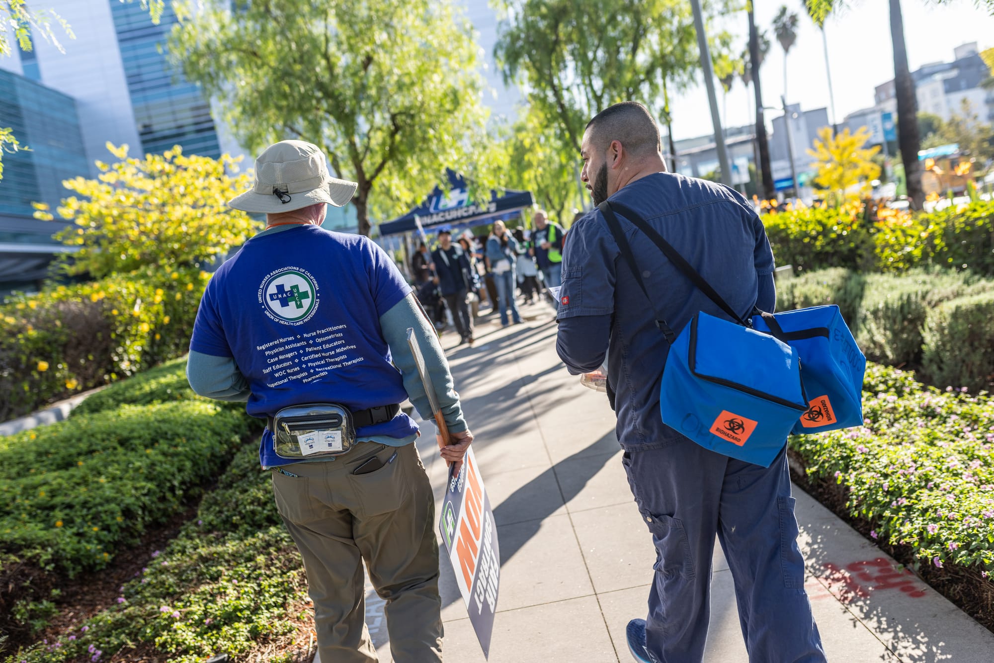 Striking healthcare workers hit the picket line together in Los Angeles on Oct 15, 2025. Photos by J.W. Hendricks.