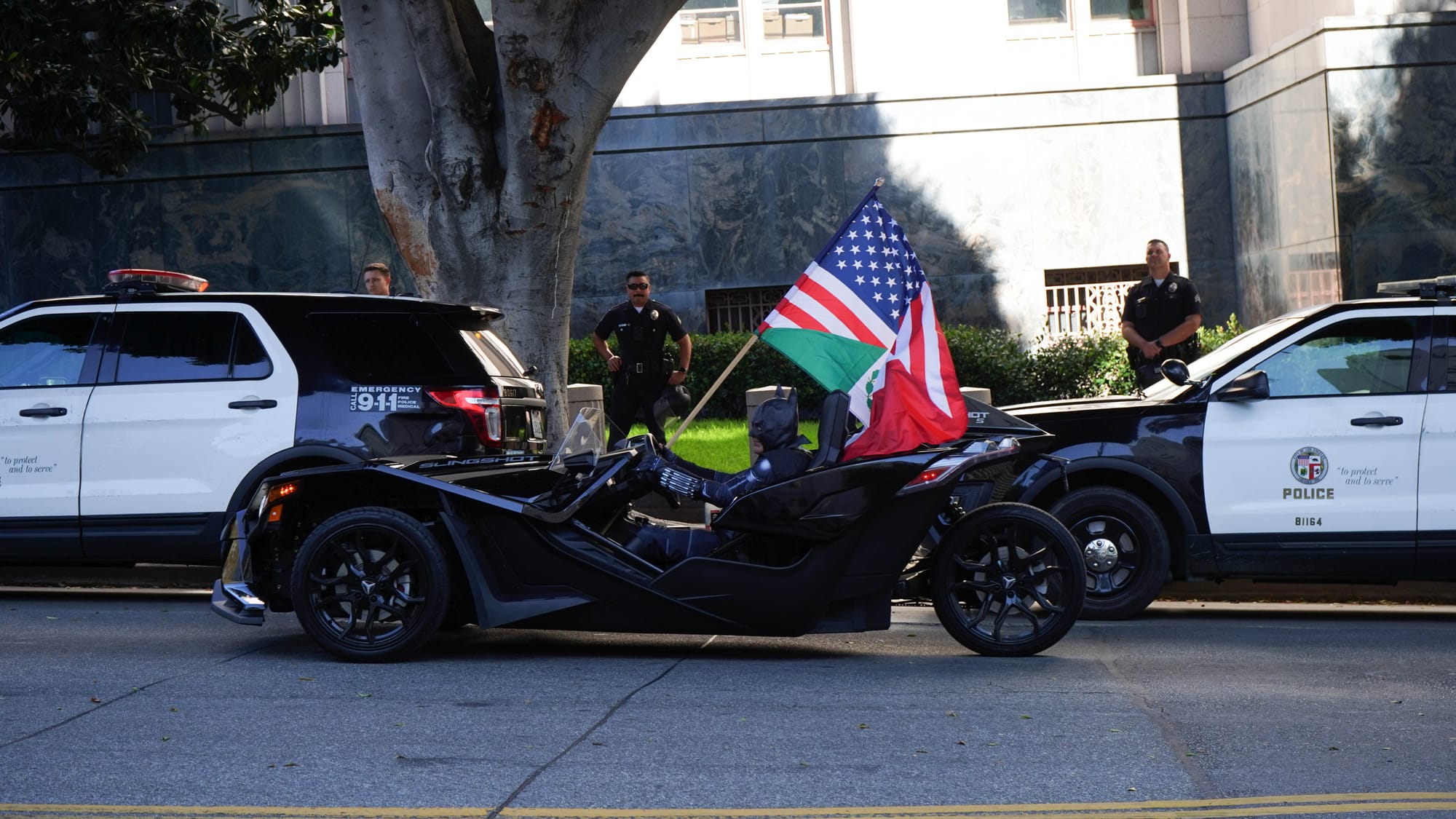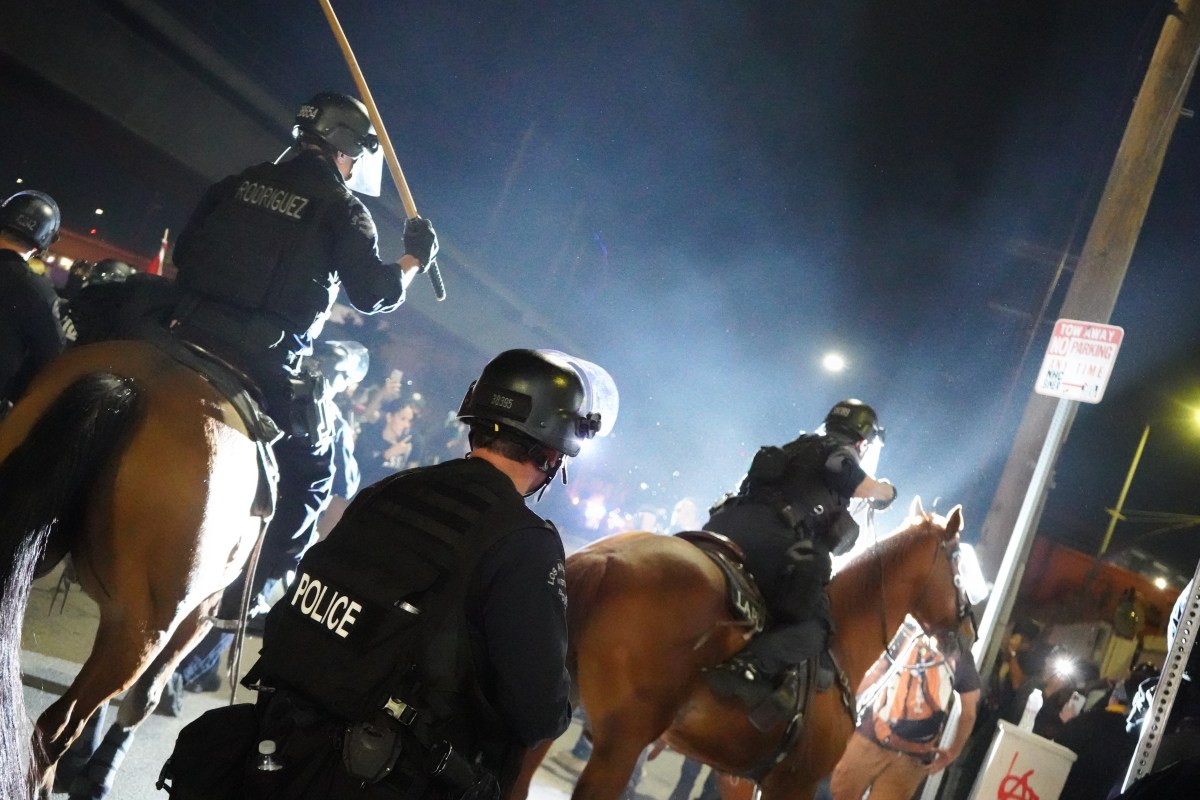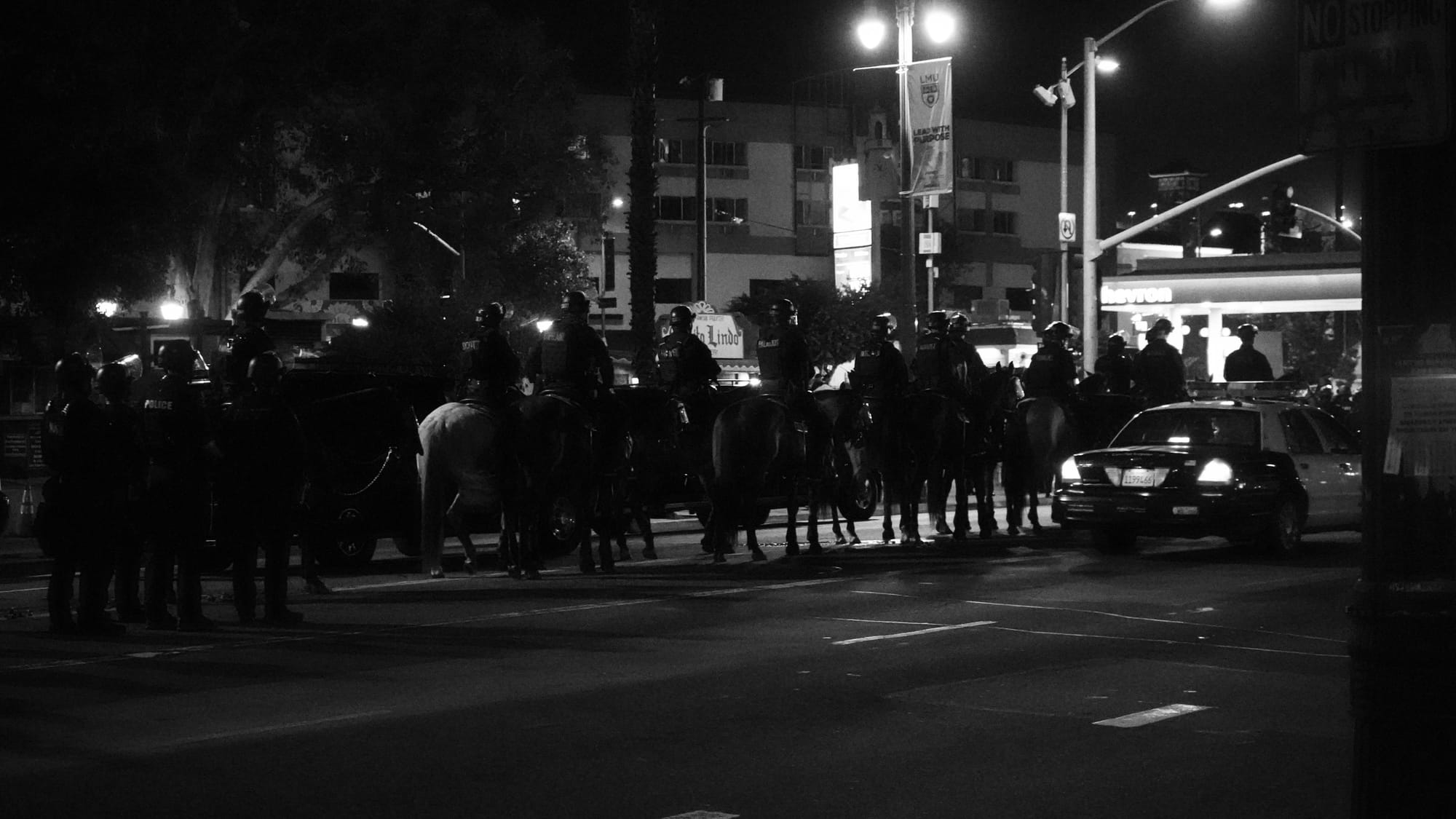 There were hundreds of LAPD for a group of maybe 30 protesters. Mounted police, riot cops in full kit, lines of Suburbans choked off Alameda for nearly a block behind the skirmish line.
